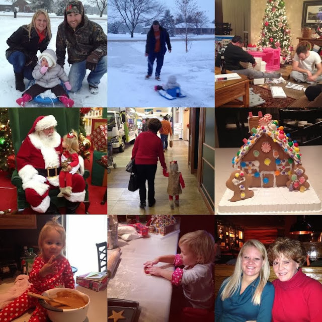 This past weekend, my parents came up from North Carolina to have our Christmas. And, boy, did we! It was a fun-filled Christmas weekend! We visited Santa, made a gingerbread house, played in the snow, opened presents, made cookies and pumpkin bread, and went to our local Festival of Lights. Sunday night, T was in bed by 7 pm, and she slept until 8:30 the next morning! To say she was exhausted is probably an understatement, but I know she had so much fun with her Gigi and Papa Jeffy! It was a fabulous weekend that went by way too quickly.